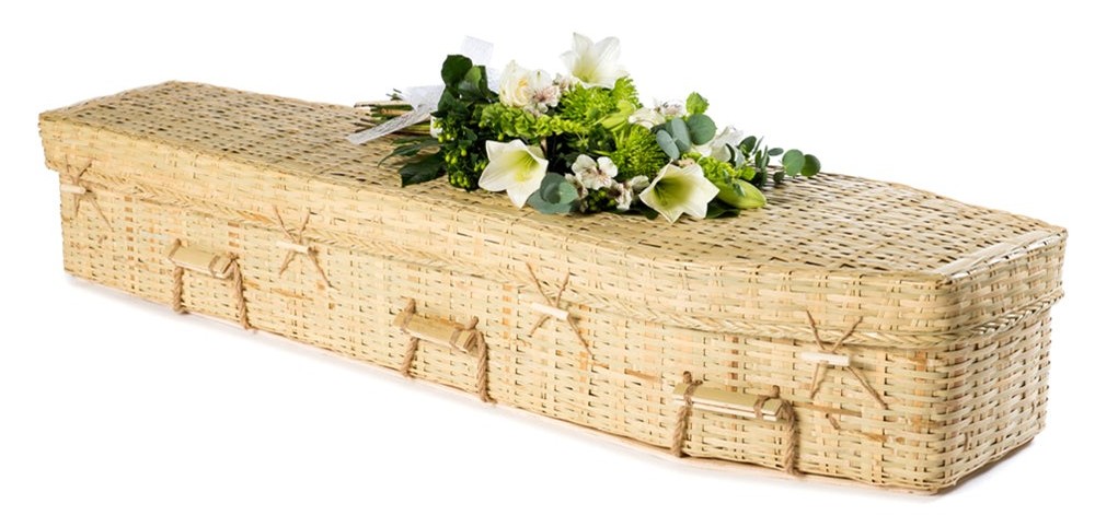 These woven bamboo coffins are available in either the rounded or traditional style,and are made in China by a British company with Fair Trade status. They each have a calico lining and 6 strong handles, and the lids are secured by bamboo toggles. There are 2 styles: the Eco, which has the same weave all over; and the Lattice, which has wider bands of bamboo woven over the underlying, smaller weave to give that lattice effect. Both styles come in the traditional shape and the curved-ended shape, and in a variety of sizes.